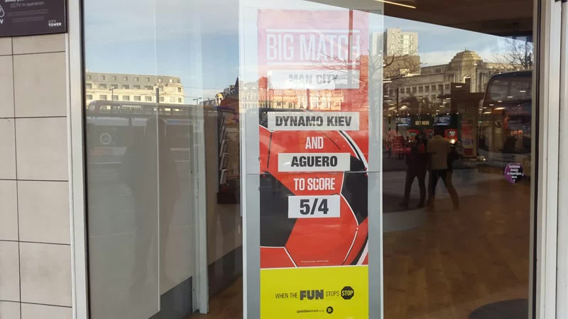 Сегодня состоится ответный матч 1/8 финала Лиги чемпионов "Манчестер Сити" - "Динамо", и англичане оценивают шансы на победу "горожан" и гол Агуэро как 5 к 4, о чем говорит один их плакатов в Манчестере.