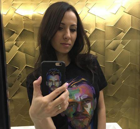 Жена вингера киевского "Динамо" Андрея Ярмоленко Инна в своем Instagram поделилась фотографией, на которой она в футболке с оригинальным принтом лица своего мужа и с соответствующим чехлом на телефоне (Футболка и чехол из интернет-магазина киевского "Динамо").