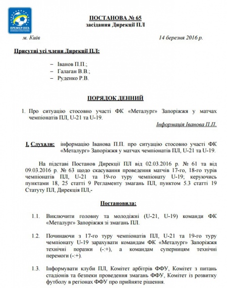 За результатами засідання запорізький Металург був виключений зі змагань під егідою УПЛ.