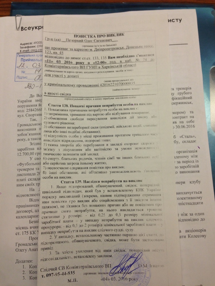 Также руководитель Фонда социальной защиты футболистов и тренеров отметил, что передал в Генеральную прокуратуру Украины документы по невыполнению условий перед тренером молодежной команды днепродзержинской «Стали» Олегом Колесовым.