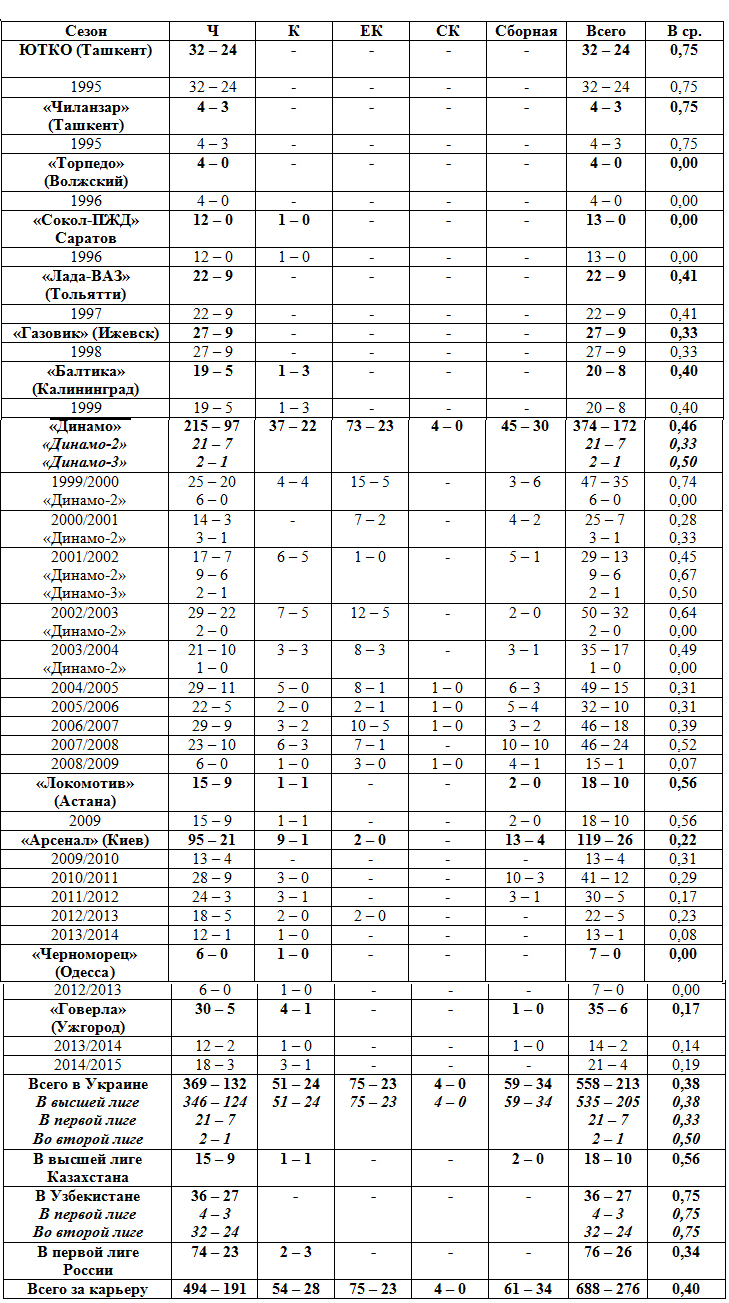 1 - «Сатурн» (Раменское), «Текстильщик» (Камышин), «Уралмаш» (Екатеринбург), «Торпедо» (Демитровград), «КамАЗ» (Набережные Челны), «Дружба» (Майкоп), «Знамя Труда» ( Орехово-Зуево), «Торпедо» им. Стрельцова (Москва), «Ольборг» (Ольборг), Городской стадион (Тернополь), «Звезда» (Ингульск), «125-летия ДМЗ» (Донецк), «Филипс» (Эйндховен), «Металлург» им. Куценко (Никополь), «Азовсталь» (Мариуполь), Республиканский стадион (Ереван), «Полесье» (Житомир), «Сент-Джеймс Парк» (Ньюкасл), «Авангард» (Луцк), «Ника» (Александрия), «АвтоЗАЗ» (Запорожье), «Максимир» (Загреб), РСК «Олимпийский» (Донецк), «Локомотив» (Москва), им. Короля Абдуллы (Амман), Армейский стадион (Читтагонг), «Шах Алам» (Куала-Лумпур), Олимпийский стадион «Асим Ферхатович» (Сараево), «Фиолент» (Симферополь), «Нефтяник» (Ахтырка), Национальный стадион (Сингапур), «Сайтама» (Сайтама), «Окжетпес» (Окшетау), «Шахтер» (Караганда), «Донбасс-Арена» (Донецк), «Колос» (Борисполь), «Ле Кок Арена» (Таллинн), Национальный стадион (Манама), «Гаррафа» (Доха), «Металлург» (Донецк), «Металлург» (Турсунзаде), «Оболонь-Арена» (Киев), Центральный городской стадион (Черкассы)