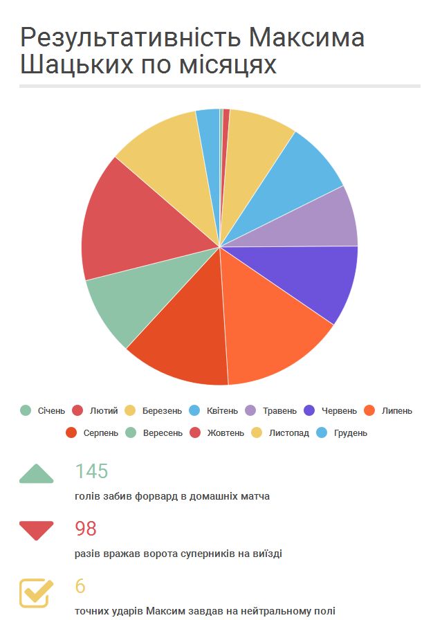 Статистика показывает, что в игровые времена года Шацких стабильно много забивал летом (92 гола) и осенью (88), а вот весенняя результативность несколько слабее – 59 мячей. Показательно, что самым успешным для Максима был месяц октябрь, то есть самый горячий еврокубковый период. Только на два результативных выстрела меньше Шацких сделал в июле. В этот период нападающий львиную долю своих голов забил в составе сборной и на стартовых стадиях Лиги чемпионов.