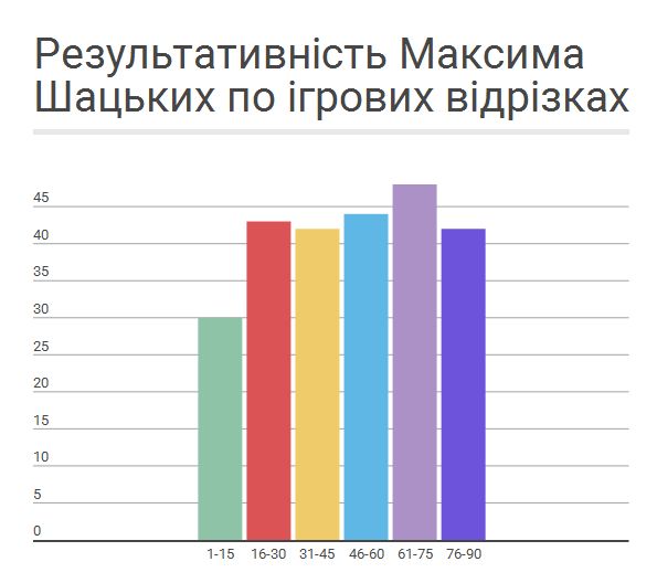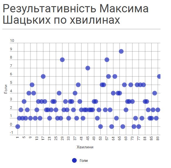 По матчевым отрезкам голы Шацких распределяются приблизительно равномерно. Только в дебютах встреч Максим забивал немного меньше. Если же разбирать мячи узбекского нападающего поминутно, то обнаружим, что с 90-игровых минут нетронутыми остались только шесть.