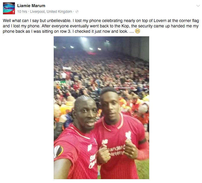 Фанат "Ливерпуля" потерял свой телефон на "Энфилде" во время празднования победы "Ливерпуля" над "Боруссией" Д в 1/4 финала Лиги Европы.
