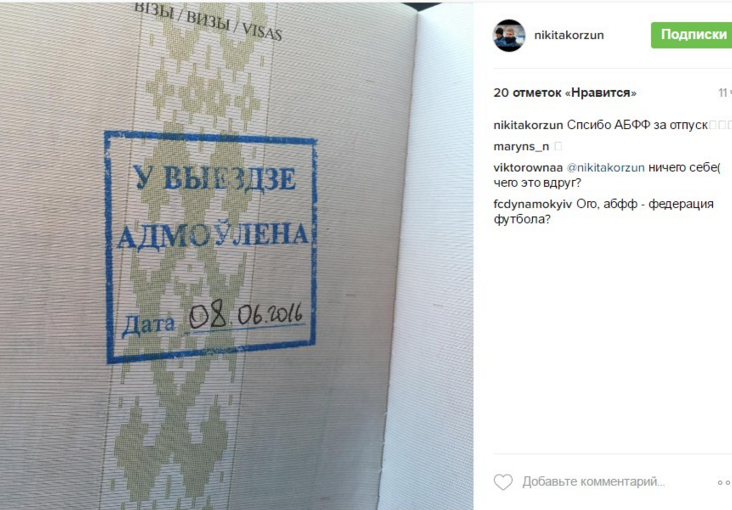 Полузащитник «Динамо» и сборной Беларуси Никита Корзун продемонстрировал фотографию своего паспорта, где стоит штамп в отказе выезда за границу.
