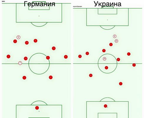 Напоследок предлагаю сравнить статистику и усреднённые позиции игроков сборной Германии в матче против Украины и аналогичные показатели в нашей игре против Северной Ирландии".