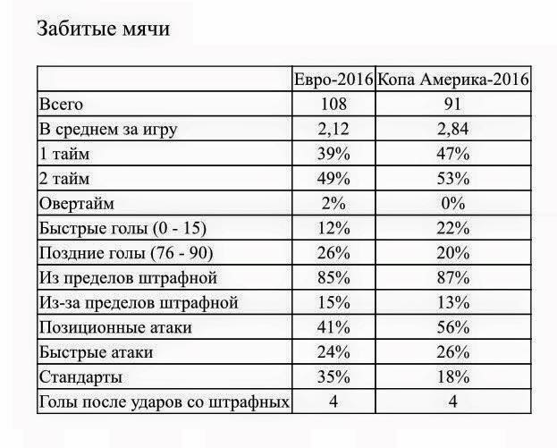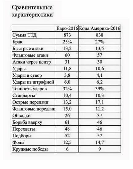 "По просьбам читателей сравнил показатели ТТД и не только на двух крупных турнирах, проходивших совсем недавно на разных континентах. Понятно, что прошли времена, когда футбол делился на бразильский и английский, аргентинский и немецкий, но определённые особенности все же просматриваются. Думаю, вам не составит большого труда оценить их самостоятельно...".
