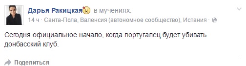 "Сегодня официальное начало, когда португалец будет убивать донбасский клуб", – написала Ракицкая на своей странице в Facebook. Отметим, что Ярослав Ракицкий не попал в заявку "Шахтера" на этот матч.