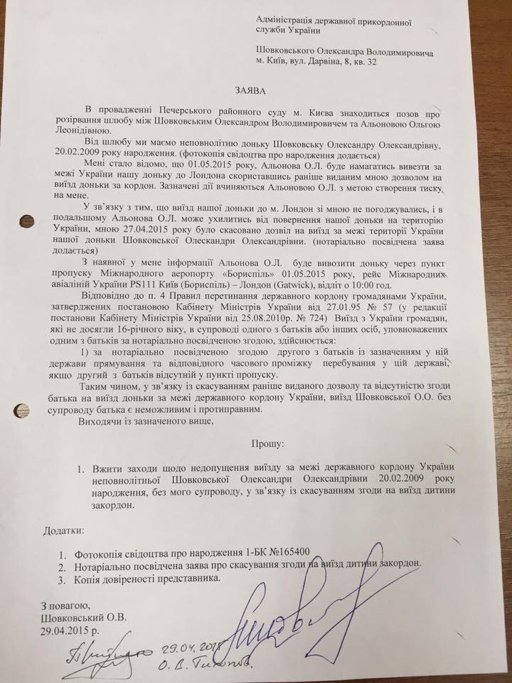 Голкипер "Динамо" Александр Шовковский в своем Facebook о вывозе его дочери за пределы Украины без согласия отца.