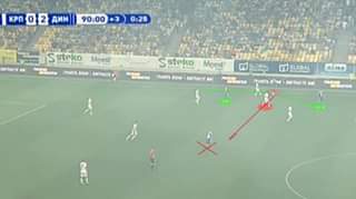 Первую и единственную оплошность допустил на 15 попытке. И ошибка эта могла стоить очень дорого. Полностью от недуга подхваченного в матче с Ман Сити пока не излечился. На скрине видно, что никто не мешал Денису запустить на рывок Морозюку или откатить назад на Ярмоленко, но Гармаш просто подарил мяч сопернику. Буяльский из игры этим пасом был выведен, Морозюк располагался выше Ярмоленко, сзади фактически оставались трое: Рыбалка, Драгович и Вида. Антунешу было бы не легко быстро вернуться в "активное" сопротивление. Пояснять на пальцах, чем такие детские ошибки грозят в играх Лиги Чемпионов, думаю, не стоит...