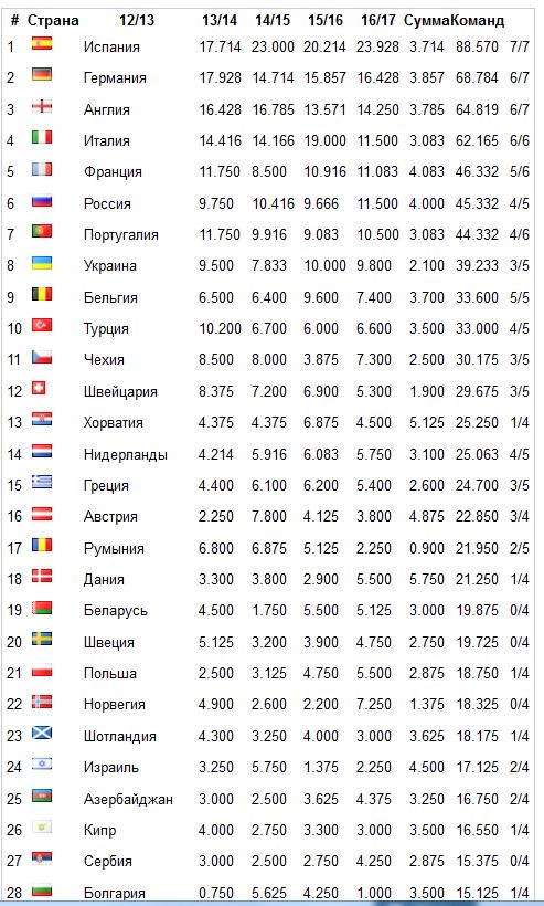 Таблица коэффициентов УЕФА: продолжаем отставать