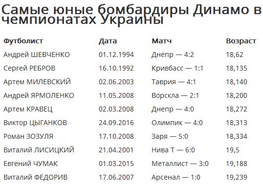 А рекорд Динамо в чемпионате Украины был установлен очень давно — еще в первой половине 1990-х. Причем первым 18-летним бомбардиром киевлян в ЧУ был нынешний главный тренер Динамо Сергей Ребров. А вторым — нынешний наставник национальной сборной Украины Андрей Шевченко.