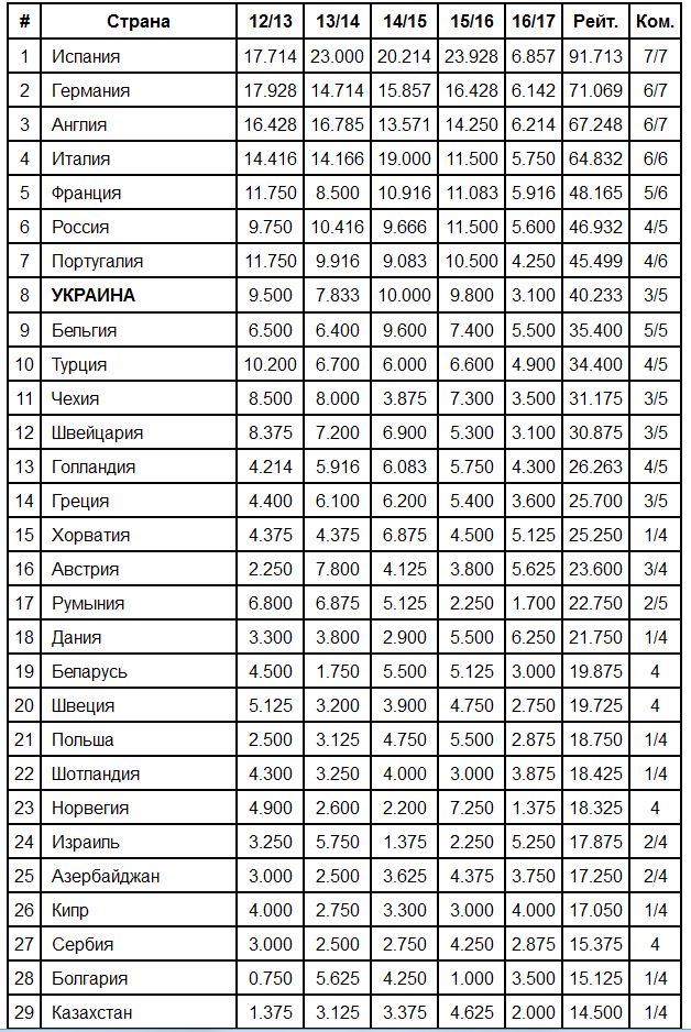 В этом сезоне Украина по коэффициенту делит в Европе 22-е место, набрав меньше Кипра и Азербайджана.