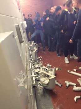 Сразу после финального свистка во встрече сторонники "горожан" спустились в подтрибунные помещения "Олд Траффорд" и начали по-вандальному громить туалеты. Видео и фото сразу попали в сеть.