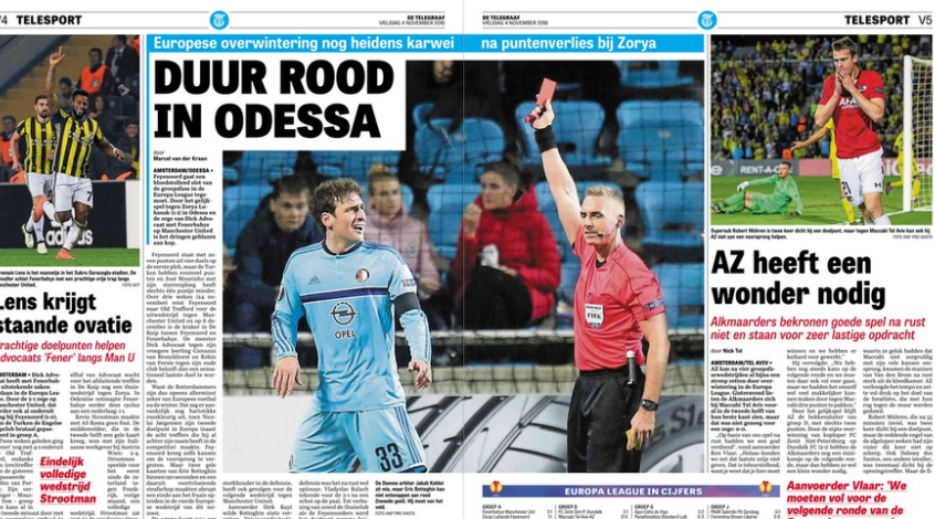 «”Фейеноорд” присматривается к плей-офф после ничьей с в Одессе, - пишет Барт Влитстра из de Volkskrant. – Игра «Фейе» в последнее время вызывает много недовольства. Единственный плюс – что команда не терпит поражений. Но в матчах с «Аяксом» и «Херенвеном» роттердамцы создали гораздо больше моментов, чем соперники, и все равно не могли победить. Примерно так же прошла и игра в Одессе против «Зари». Совершенно необязательная потеря очков, ведь команда ван Бронкхорста хорошо стартовала и рано повела в счете. Датский феномен Николай Йоргенсен забивает постоянно!.. Если, конечно, не менять его в конце первого тайма. А сегодня тренеру пришлось сделать именно это, ведь после удаления Боттегина нужно было закрывать дыру в обороне (...) Матч «Зари» с «Фейеноордом» проходил в мрачной атмосфере – не только потому, что стадион «Черноморец», и без того унылый, был заполнен только наполовину. Причина в другом. «Фейеноордцы, берегите друг друга в Одессе», - писали многие наши фан-клубы в твиттере за несколько часов до игры. Все боялись нападения местных хулиганов. Из Одессы приходили все новые видео с пожарами, полицейскими сиренами, кричащими и бегущими людьми. Этот город расположен в 950 километрах от Луганска, но «Заря» не может играть на родном стадионе из-за боевых действий в регионе».