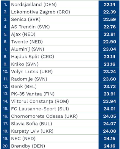 Самой молодой командой в Европе является датский "Норшелланн", средний возраст футболистов – 22,14.