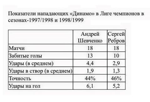 Вчера Артем Беседин вообще не бил по воротам, а Жуниор Мораес сделал это однажды. Всего в пяти матчах нынешней ЛЧ форварды «Динамо» сообща нанесли аж… семь ударов. Мне стало жутко интересно, как обстояли дела с нацеленностью на ворота у нападающих команды конца 90-х годов. Так вот, оказывается, Андрей Шевченко в тех двух легендарных сезонах нанес по воротам 79 ударов в 18 матчах. Зато у Сергея Реброва была выше эффективность выстрелов...