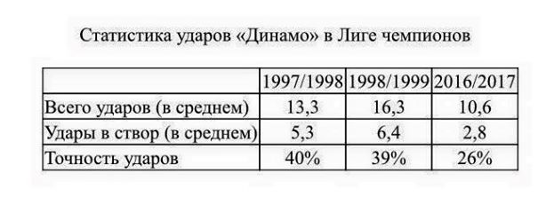 В те годы, если вы помните, динамовцы редко кого превосходили по владению мячом, но за счет быстрых контратак всегда действовали в атаке довольно агрессивно. А в нынешнем сезоне киевляне входят в пятерку худших клубов ЛЧ по количеству ударов в створ ворот.
