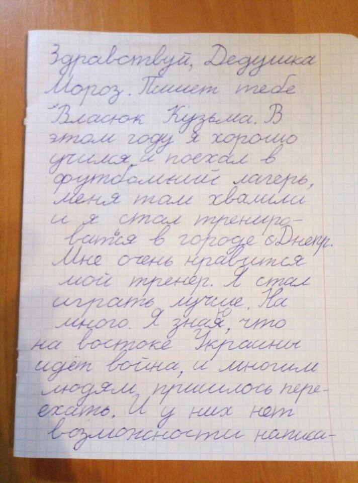 «Это Власюк Кузя, ему 8 лет! Он из Никополя! Он ученик нашей академии! Мы познакомились с ним летом, когда он приехал первый раз в лагерь и провёл с нами почти целое лето! После окончания лагеря Кузя понял, что хочется заниматься футболом! И выбрал нашу академию! его родители приняли очень важное решение, они дали Кузе эту возможность! Каждый день возят его в Днепр, на тренировки! И вот к нам попало письмо Кузи, которое он писал Деду Морозу! Мы гордимся тем, что в нашей академии учатся именно такие ребята, как Кузя! Спасибо его родителям, что воспитывают настоящего человека! Вот наше надёжное будущее!», - написал Зозуля в facebook.