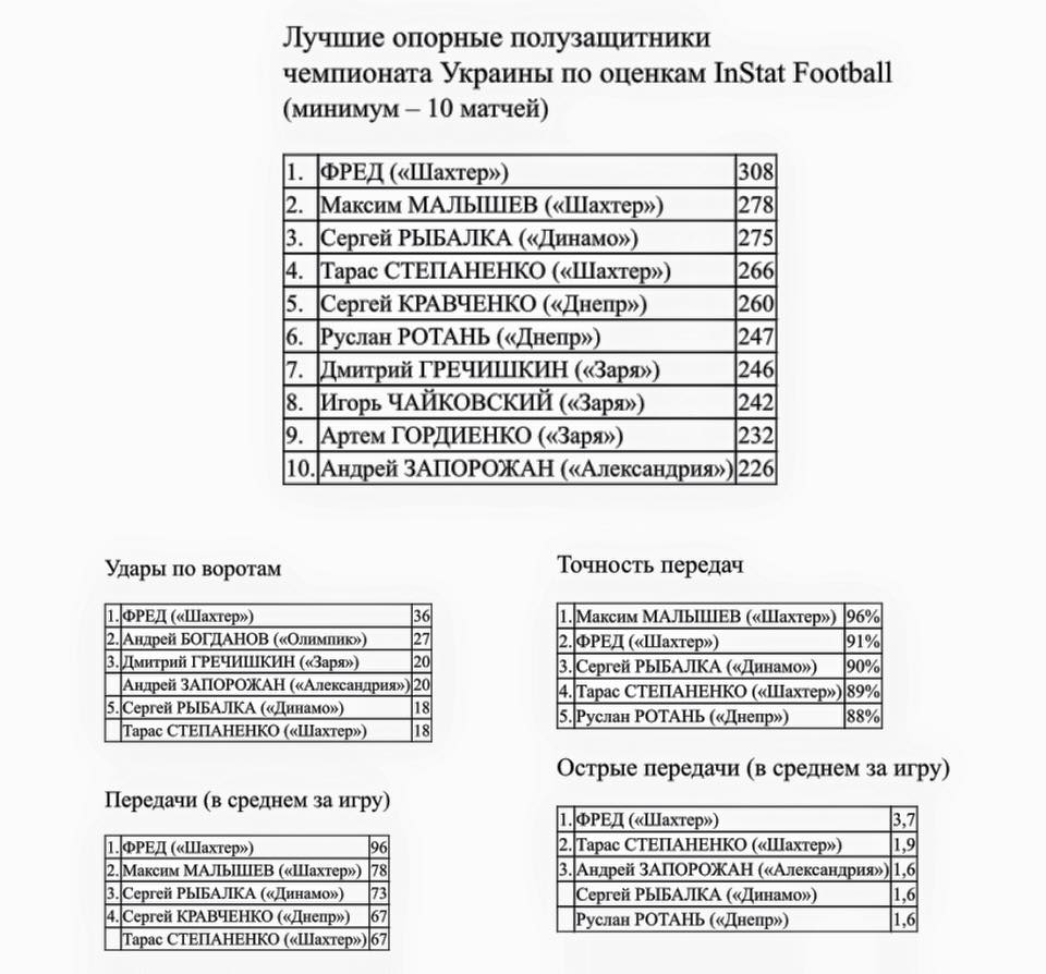 Обозреватель газеты «Команда» Евгений Гресь поделился статистикой по игре опорных полузащитников в чемпионате Украины.