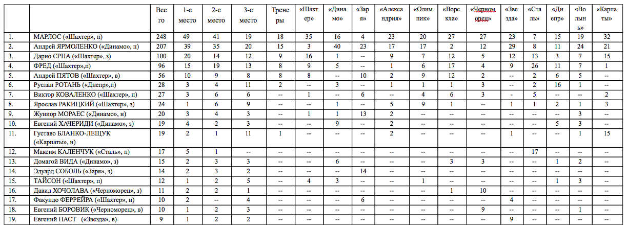 В общей сложности мы собрали мнения 180-ти футболистов и 11-ти наставников (главный тренер «Шахтера» Паулу Фонсека, сославшись на непродолжительное время работы в украинском футболе, принимать участие в референдуме вежливо отказался). В анкетах было упомянуто 73 исполнителя—на семь больше, чем в прошлом году. Стоит отметить, что в своих тройках респонденты назвали имена 15-ти легионеров, один из которых и выиграл наш опрос…