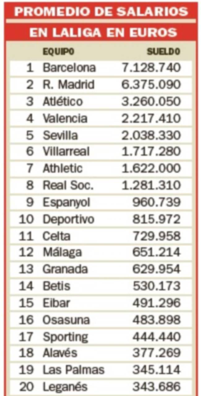 Каталонский клуб выплачивает игрокам команды в среднем по 7,1 миллиона евро. Занимающий вторую строчку «Реал» имеет среднюю зарплату в 6,4 миллиона евро.