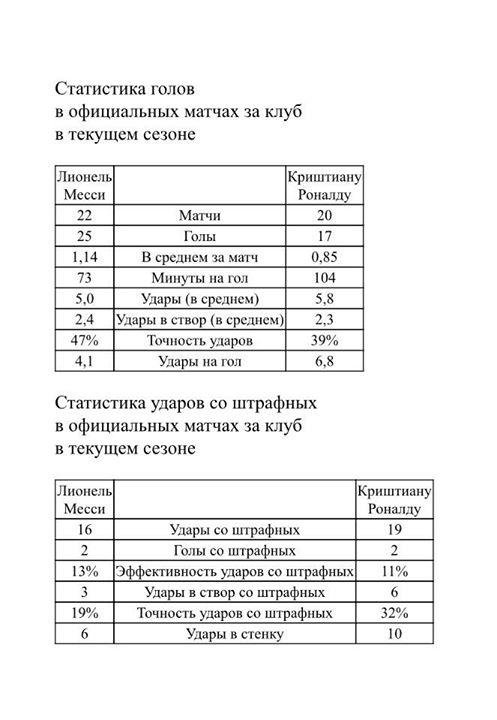 В матче с Вильярреалом Месси, кстати, нанёс 100-й удар по воротам в сезоне. У Роналду больше, но эффективность пока хромает. В сравнении с Лео, конечно. Нам бы такие проблемы с эффективностью...".