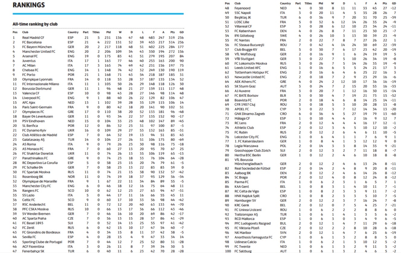 УЕФА составил сводную турнирную таблицу выступлений клубов в Лиге чемпионов. В ней отражены результаты всех европейских клубов, которые участвовали в турнире. Они сведены в единую таблицу. В результате подсчетов оказалось, что самый успешный клуб в истории турнира – "Реал". Но он всего на пять очков опережает "Барселону". А замыкает тройку "Бавария", опередившая "Манчестер Юнайтед" и "Арсенал".