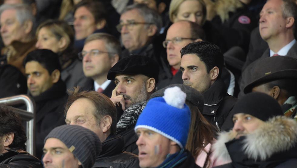 Рядом с Гвардиолой за игрой наблюдает его ассиcтент Микель Артета, а недалеко от испанского специалиста находится президент ПСЖ Нассер Аль-Хелаифи.