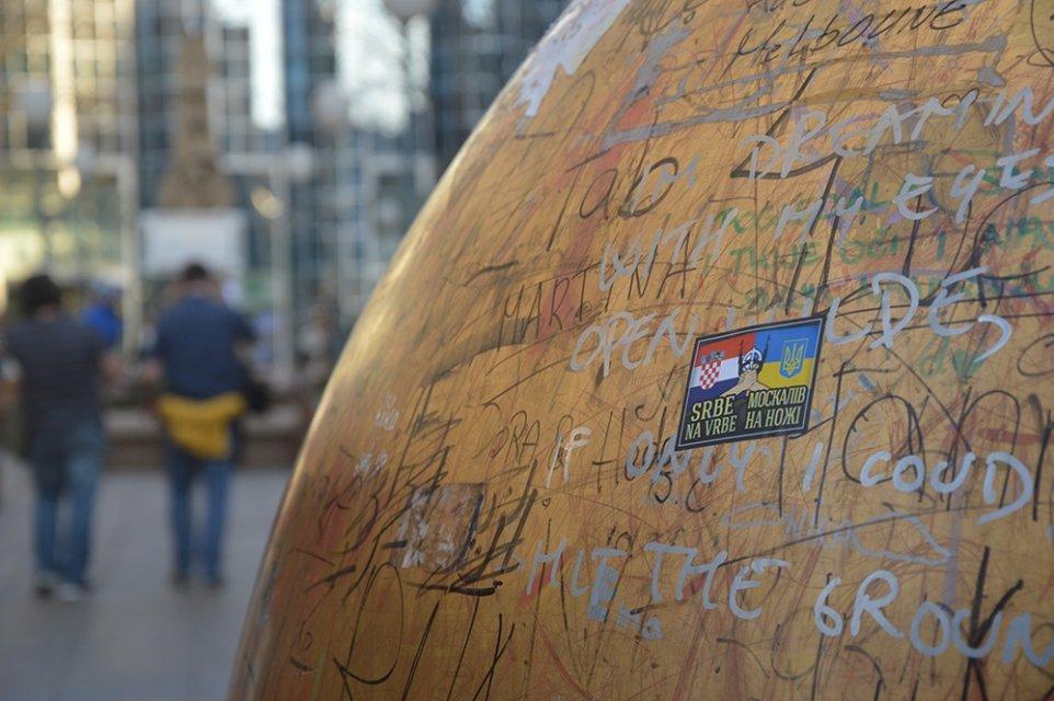Також у день зустрічі національних збірних на стадіоні «Хрватский драґоволяц» зіграли між собою команди фанатів обох країн (поєдинок завершився 7:6 на користь господарів). Крім того, українські фанати спеціально до виїзду в Заґреб підготували братські стікери, які дехто назвав провокативними, а видання української діаспори в Чорногорії вбачило в появі наліпок такого змісту «руку Кремля». Втім, правда трохи простіша.
