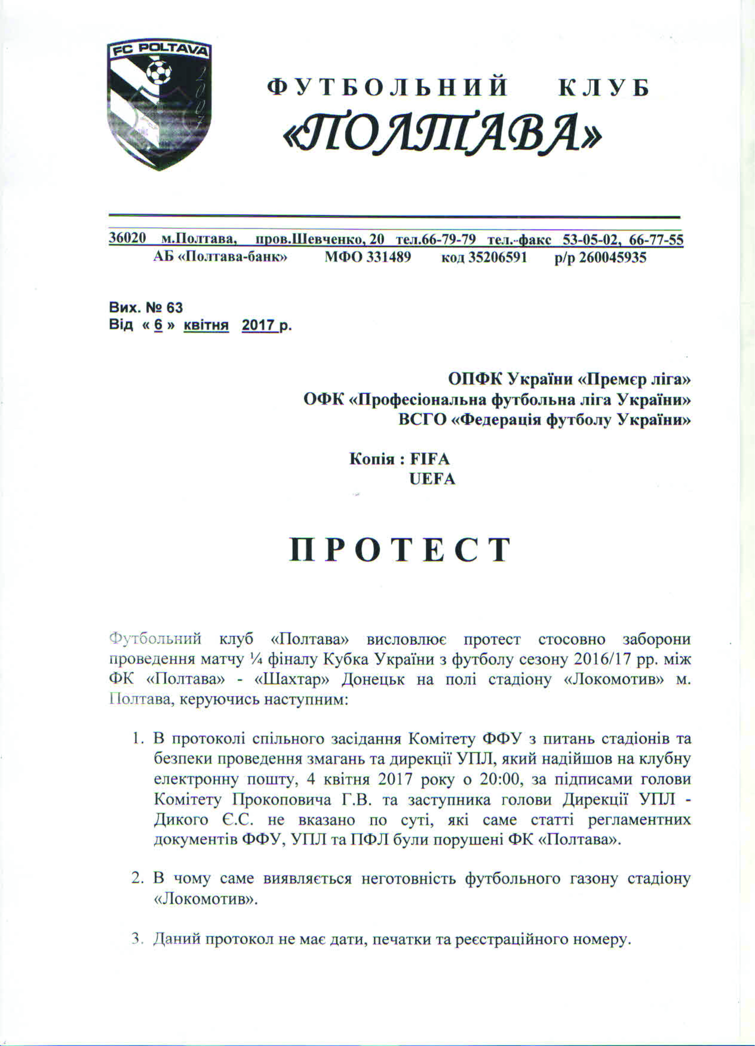 Футбольний клуб "Полтава" вклався у 24-годинний термін подачі протестів на матчі, і направив відповідні документи з приводу кубкової гри із "Шахтарем" до ПФЛ, УПЛ, ФФУ, а також УЄФА і навіть ФІФА.