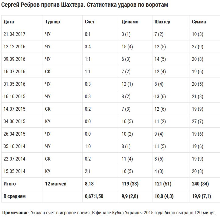 zbirna.com приводит статистику ударов по воротам "Динамо" в матчах против "Шахтером" под руководством Сергея Реброва.