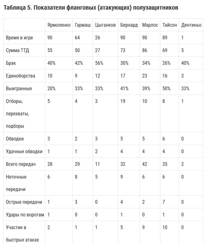 Анализ командных действий показал, что при равной игре у Шахтера, который благодаря быстрому голу это равенство устраивало, было преимущество в ключевых показателях в атаке. Обеспечила его группа иностранных игроков, и в этом можно легко убедиться по таблице 5. Справедливости ради, нужно отметить, что в атаке горняков было больше футболистов, которые создавали соответствующую компактность. Бразильские игроки Шахтера выглядели намного агрессивнее, но они получали больше передач от партнеров, а потому, видимо, и в два раза активнее вступали в единоборства, совершили в три раза больше обводок и в шесть раз чаще участвовали в быстрых атаках. При этом обратите внимание на то, как оборонялся Бернард — по количеству отборов, перехватов и подборов он стал лучшим игроком матча в своей команде.