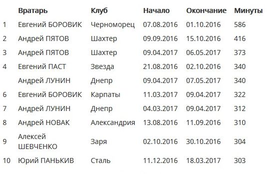Самые длинные сухие серии вратарей в ЧУ-2016/2017