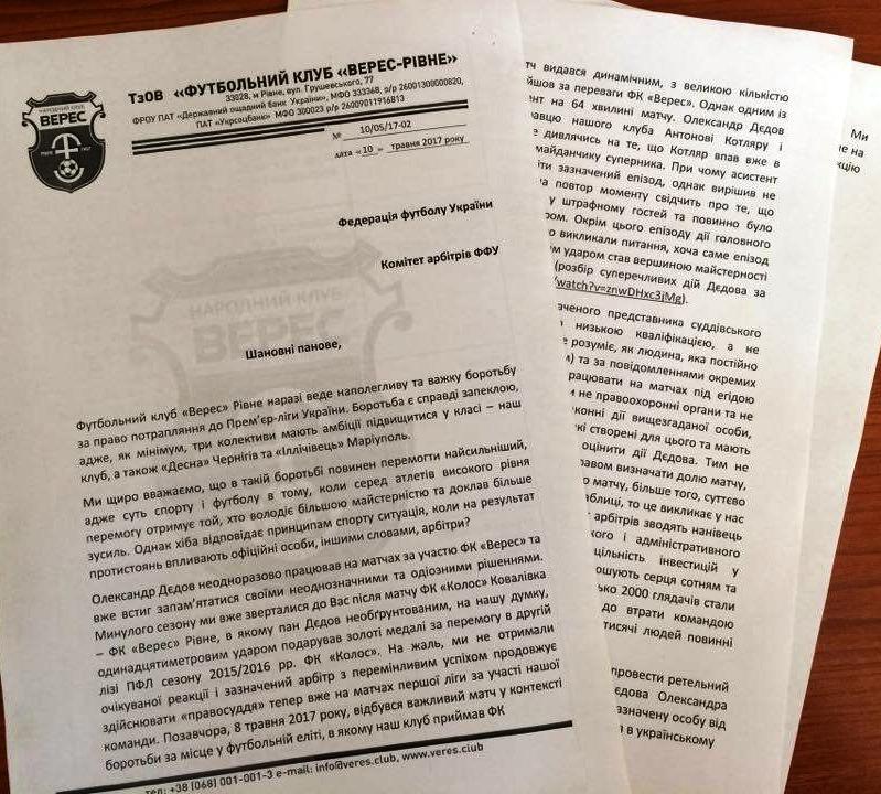Результативні рішення арбітра Олександра Дєдова, що вплинули на підсумок матчу «Верес» - «Оболонь-Бровар», і зокрема непризначений стовідсотковий пенальті, змусили керівництво нашого клубу у пошуках правди звернутися з листом до Федерації футболу України та Комітету арбітрів ФФУ.