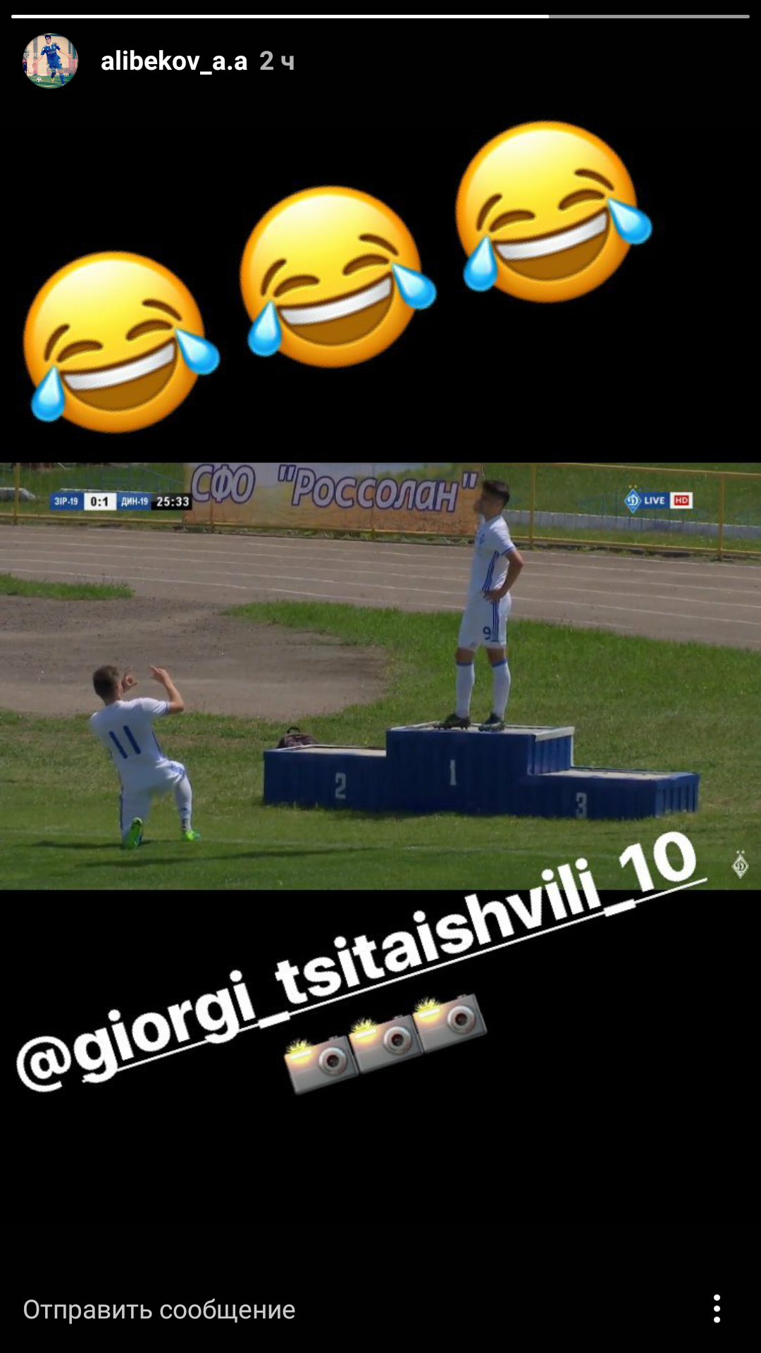 Полузащитник «Динамо» U-19 Ахмед Алибеков оригинально отпраздновал мяч, забитый в ворота «Зирки». Футболист забрался на пьедестал, а другой полузащитник киевлян, Цитаишвили, сделал вид, что фотографирует Алибекова.