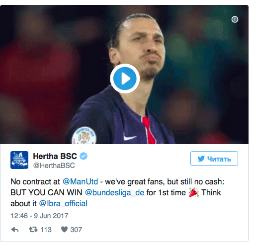 Официальный твиттер "Герты" предложил нападающему Златану Ибрагимовичу пополнить ряды команды, чтобы выиграть Бундеслигу.