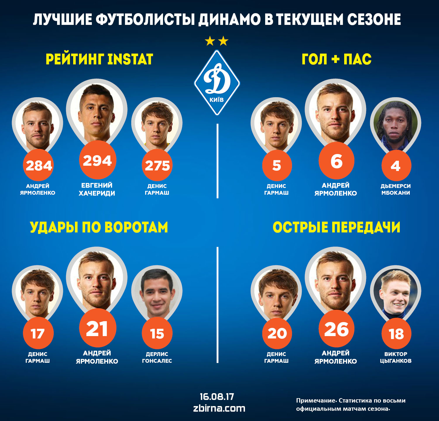 Почти по всем атакующим показателям лидирует Андрей Ярмоленко. По сравнению с прошлым сезоном у Динамо стало намного меньше обводок, но при этом каждую четвертую из них выполняет капитан команды. Ярмоленко занимает первое место по числу ударов по воротам и острых передач, но это картина привычная. А вот Сергей Сидорчук приятно удивляет, занимая первую строчку в рейтинге лучших игроков коллектива по количеству отборов. Центральный полузащитник в этом рейтинге и должен лидировать, но раньше там лидировали представители других амплуа. Видимо, нашел Сидорчук в этом году свое место на поле.