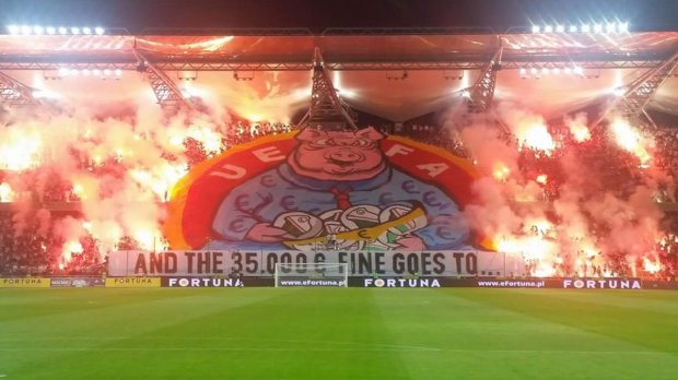 На матче 4-го квалификационного раунда Лиги Европы против молдавского Шерифа ультрас польского клуба посвятили УЕФА огромный баннер со свиньей и деньгами, подписав его: "И штраф в 35 тысяч евро идет к ...".