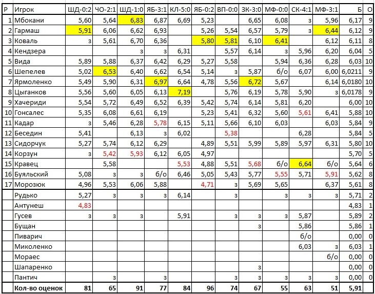 Желтым выделены игроки с лучшей оценкой за матч, красным - с худшей.