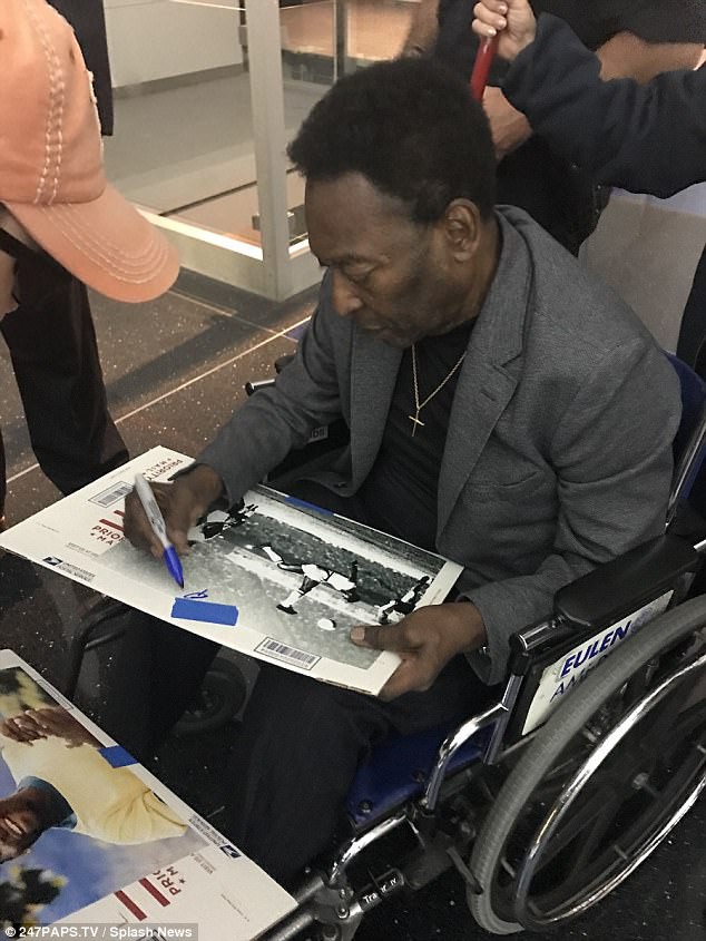 Легендарный бразильский нападающий Пеле был замечен в инвалидной коляске в международном аэропорту имени Джона Кеннеди. Пеле раздавал автографы и подписывал памятные вещи для нескольких поклонников по прибытии в Нью-Йорк, информирует Daily Mail.