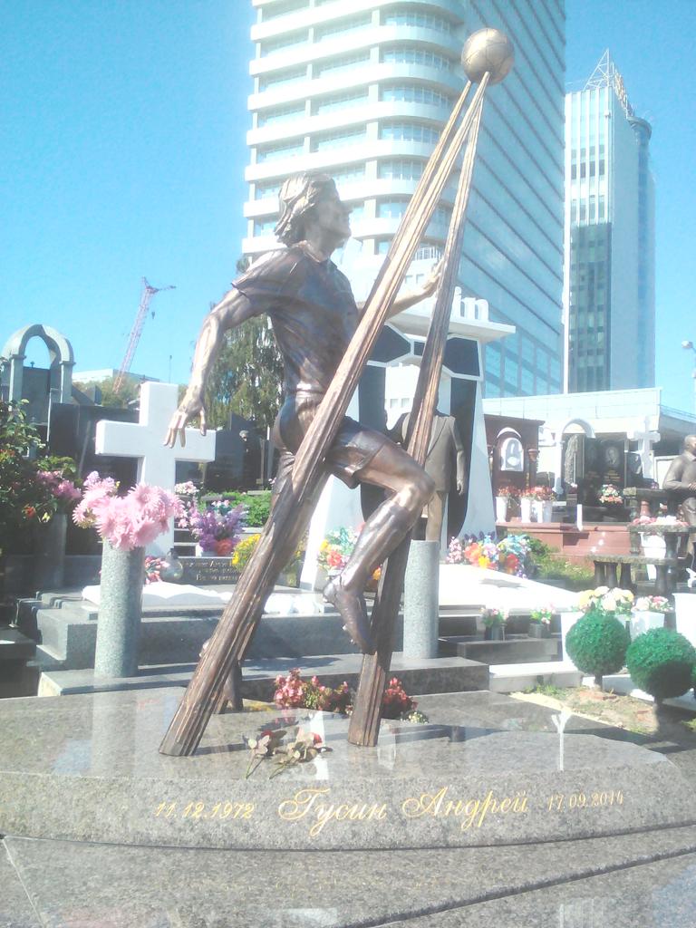 "Установили памятник Андрею Гусину - сегодня три года как... Вперед и вверх, да на скорости! Дорогой друг.... Другой ракурс. Лига чемпионов, Динамо Киев, сборная Украины, Андрей Гусин! Мне памятник понравился, сделано с любовью и смыслом, то есть огромным уважением. Самое сложное было согласовать вИдение родных и близких".