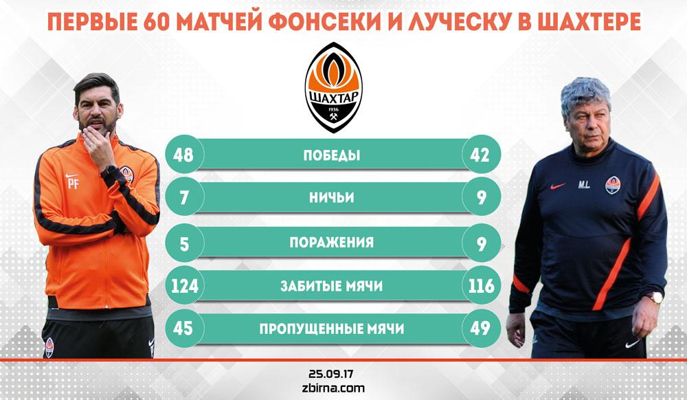 Первые 60 матчей Паулу Фонсеки в Шахтере принесли команде 48 побед — португальский специалист опережает успешный график своего предшественника Мирчи Луческу. Впрочем, не стоит забывать, что в середине 2000-х годов уровень чемпионата Украины был намного выше. Второй момент — количество поединков в еврокубках. В число 60-ти первых матчей Луческу в Шахтере вошло 18 еврокубковых, а Фонсека пока провел на международной арене 13 поединков. Причем только один — в Лиге чемпионов. Так что сыграет португалец 100 матчей, тогда сравнение будет намного корректнее.