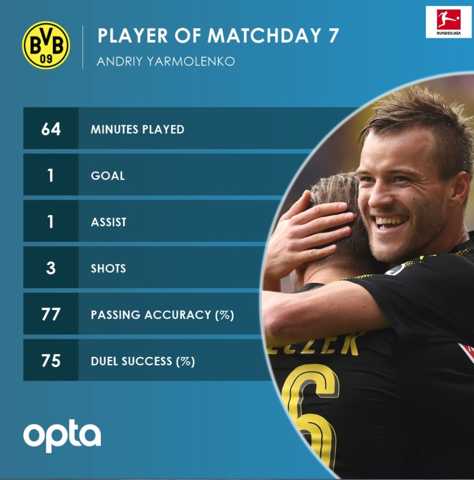 Лидер сборной Украины Андрей Ярмоленко признан лучшим игроком 7-го тура Бундеслиги по версии Opta.