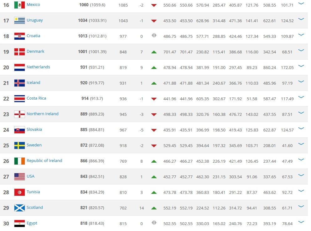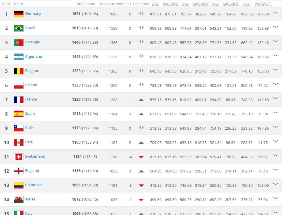 Лидером остается Германия, на втором месте Бразилия, а на третьем — Португалия. Последующие места в первой десятке занимают Аргентина, Бельгия, Польша, Франция, Испания, Чили и Перу.