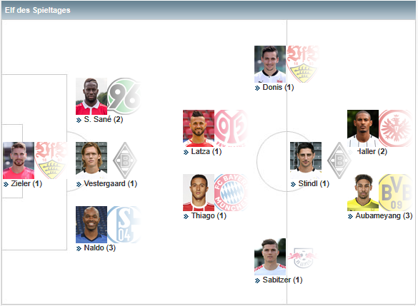 В этот раз в символическую команду не попал вингер дортмундской Боруссии Андрей Ярмоленко, который провел не лучший матч против Лейпцига (2:3). Шмелей в команде представляет только Пьер-Эмерик Обамеянг.