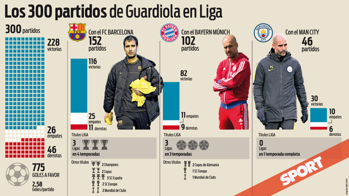 Команды испанца забили 775 мячей .что составляет 2,58 года за матч. С "Барселоной" Пеп выиграл три чемпионства за три сезона. В "Баварии" Гвардиола трижды выигрывал золото.
