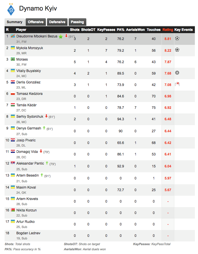 Предлагаем Вашему вниманию оценки, выставленные порталом Whoscored.com игрокам "Динамо" за матч Лиги Европы против "Янг Бойз". Лучшим стал Дьемерси Мбокани с очень высокой оценкой - 8,81.