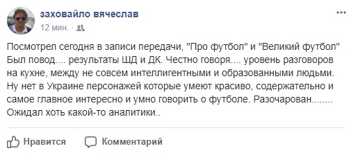 - Посмотрел сегодня в записи передачи, "Про футбол" и "Великий футбол". Был повод.... результаты ШД и ДК. Честно говоря.... уровень разговоров на кухне, между не совсем интеллигентными и образованными людьми. Ну нет в Украине персонажей, которые умеют красиво, содержательно, и, самое главное, интересно и умно говорить о футболе. Разочарован........ Ожидал хоть какой-то аналитики.. – написал Заховайло на своей странице в Фейсбуке.
