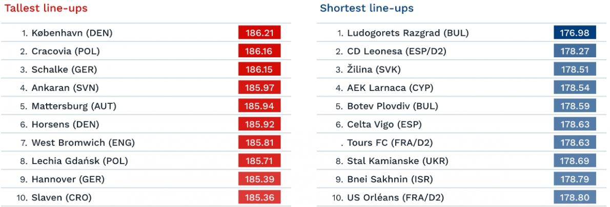 Самой высокой командой Европы оказался датский «Копенгаген». Средний рост команды — 186,21 см. На втором месте — польская «Краковия» Алексея Дитятьева (186,16), на третьем — немецкий «Шальке» Евгения Коноплянки (186,15).